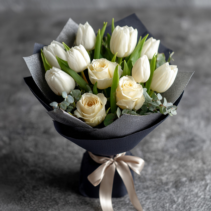 This bouquet is a poem woven from moonlight. White tulips resemble pure snow, cradling a soft glow; white roses bloom like a dream touched by frost, exuding delicate grace. Eucalyptus leaves add a hint of cool green, while black wrapping paper embraces the quiet within. A pale gold ribbon ties it all into a gentle knot — as if gathering the stillness of night and the serenity of flowers into one fragrant bundle. When eyes fall upon it, they drift into a whirlpool of white and black, where even the breeze carries a subtle sweetness, whispering stories of tranquility.